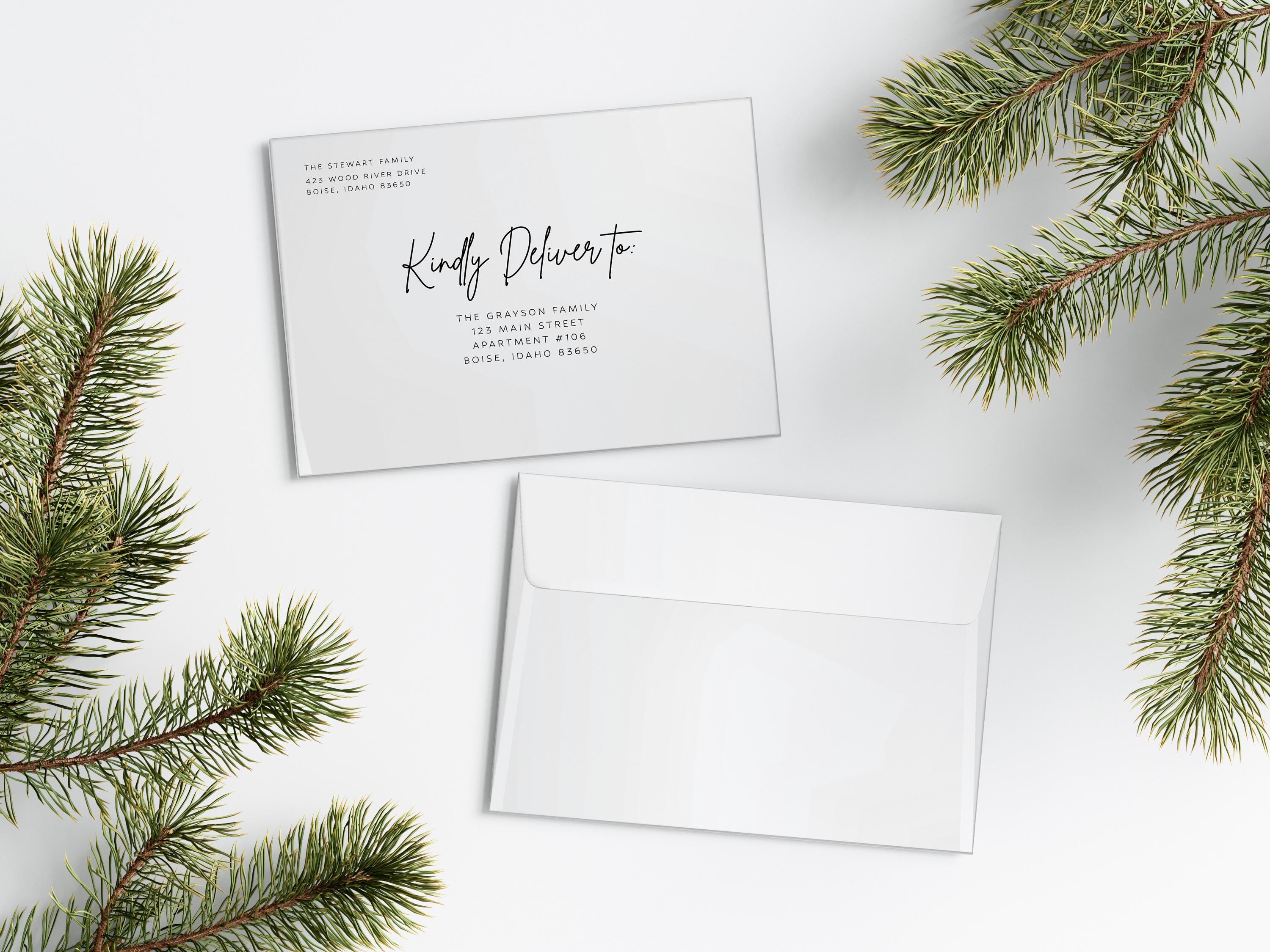 Complete your Christmas cards with custom addressed envelopes, perfectly sized for 5x7 cards. Each envelope is printed with your return address and your recipient's address, adding a professional touch to your holiday mail.