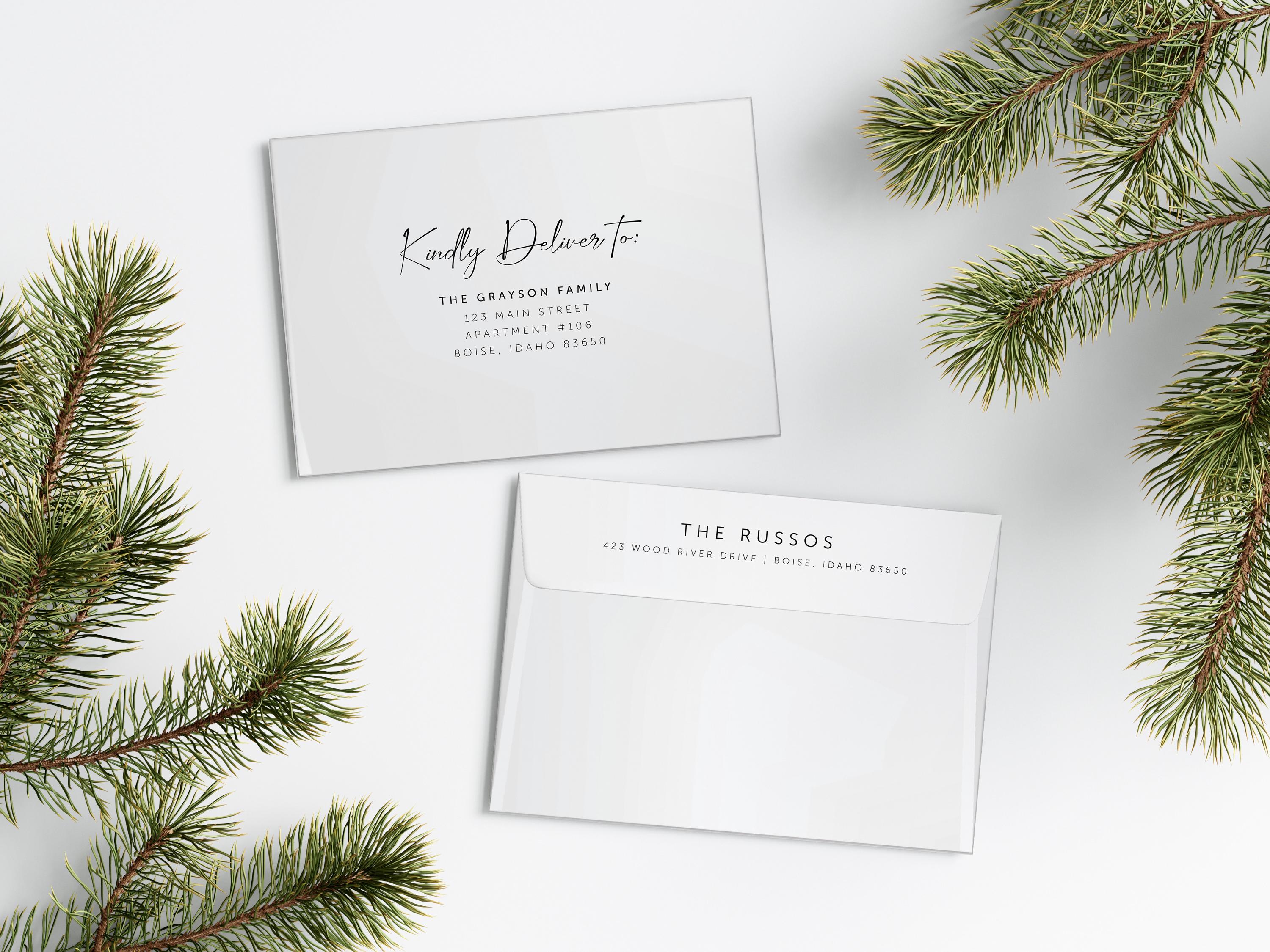 Complete your Christmas cards with custom addressed envelopes, perfectly sized for 5x7 cards. Each envelope is printed with your return address and your recipient's address, adding a professional touch to your holiday mail.